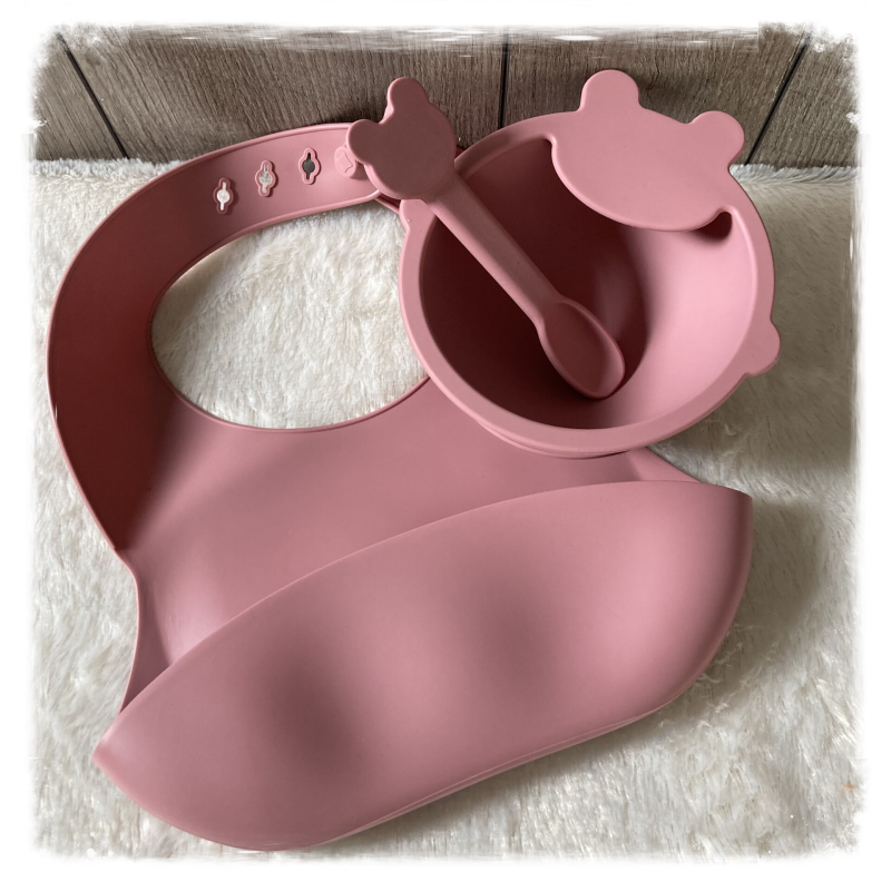 Houten kistjeSet siliconen slabbetje, kom met zuignap en lepel Beer Poederroze