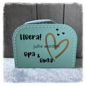 Tijdens het bestellen kun je aangeven wat voor opdruk je op het koffertje wilt. De prijs is inclusief de bedrukking.