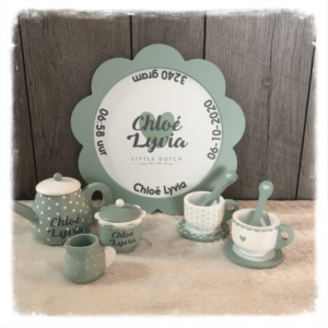 Helemaal leuk met de gegevens van het kindje erop!! Het bedrukken en feestelijk inpakken is bij de prijs inbegrepen.