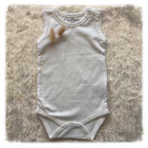 Een wit rompertje met de tekst: ‘Coming Soon’. Maatje 50/56.